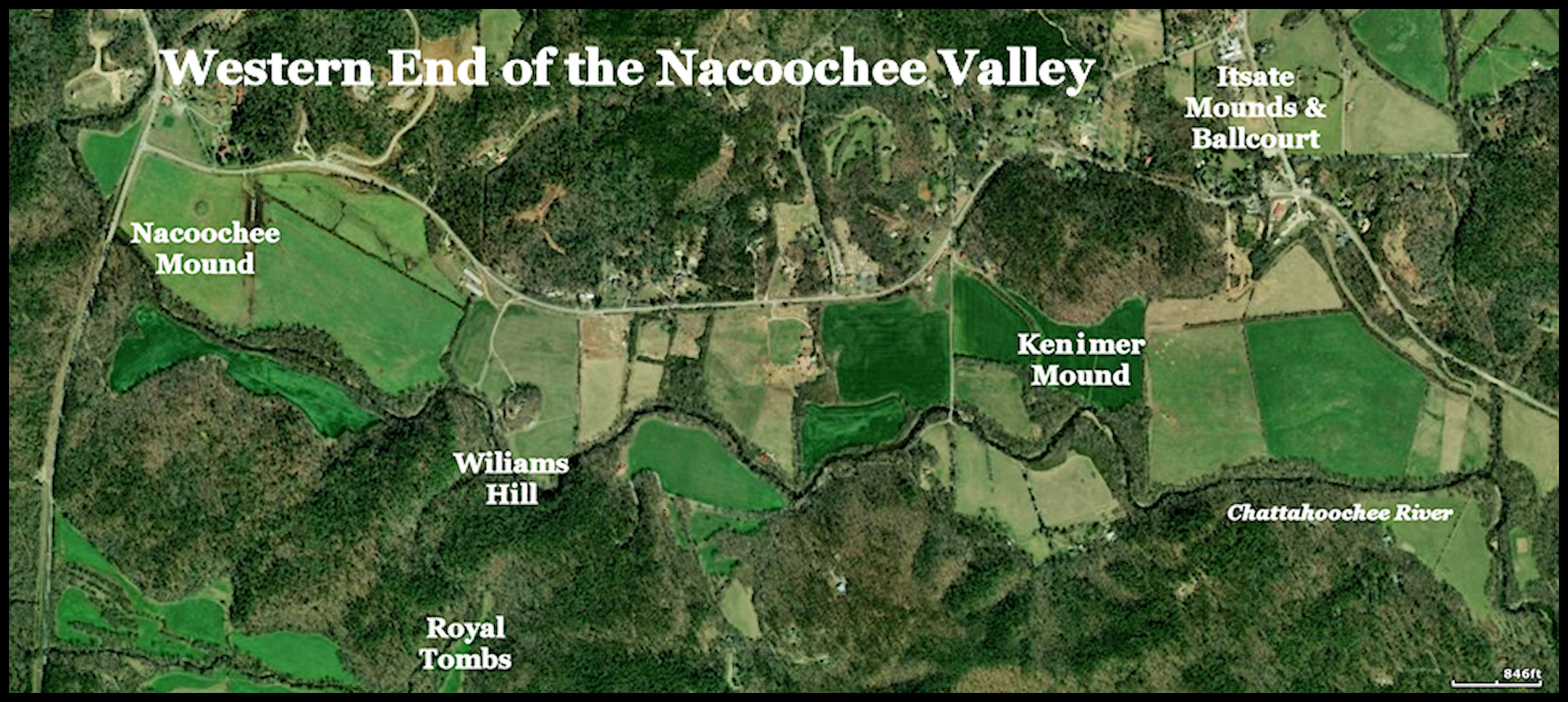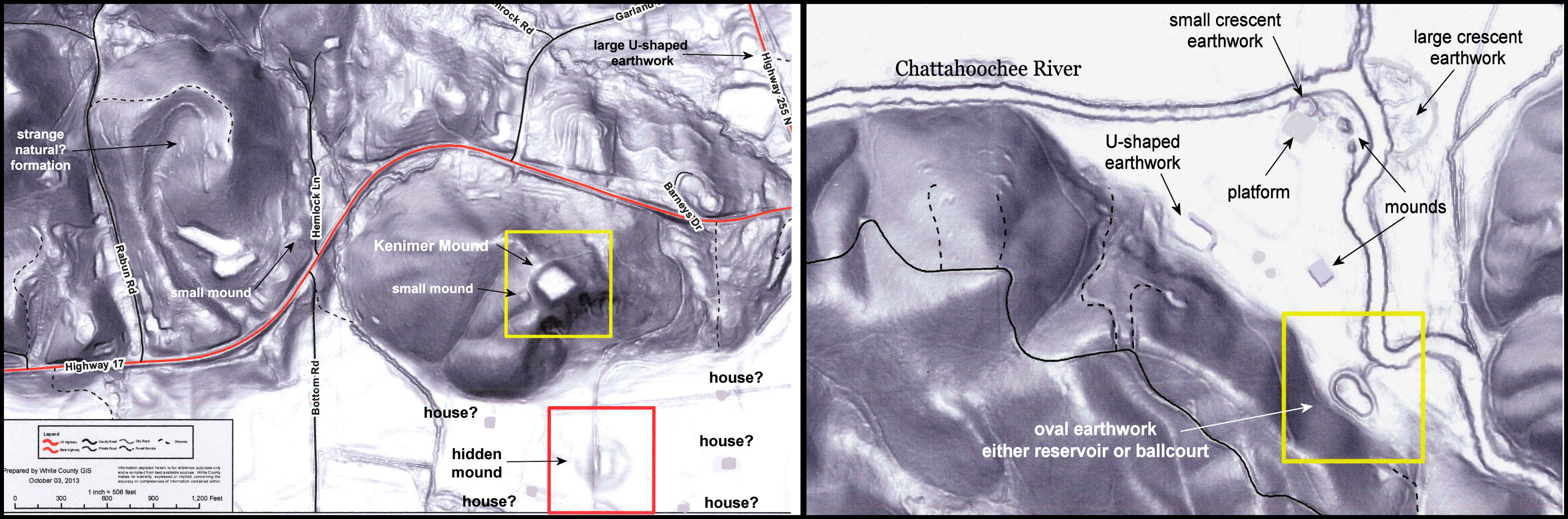 The most likely candidate for the Great Sun Temple is the massive, five-sided Kenimer Mound (see satellite photo above). It is slightly more than a mile east of Williams Hill. I had discounted this site initially because there is no evidence of a stone structure. It has never been thoroughly examined by archaeologists. However, several years ago a team of professors and students from the University of Georgia dug test pits on its cap. They found Napier Complicated Stamp potsherds, dating from the 600s AD . . . which means that the mound dates at least from that era. It may be much older. The archaeologists also determined that the mound had been sculptured from the existing contours of Kenimer Hill. Dirt was cut away from the crest of the hill and then piled on the original grade to create a large mound.