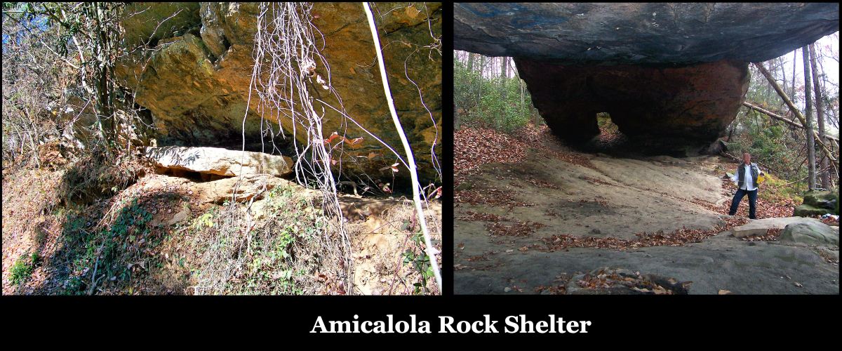 The Amicalola Rock Shelter is located in the rugged mountains immediately west of Amicalola Creek and southwest of Amicalola Falls. It is essentially a shallow cave with an entrance barely visible from 100 feet (30.5 m) away. It may be a tomb, but there is no evidence of a burial today. Its specific location is being kept confidential because of the vulnerability of this unusual archaeological site to vandalism. Although abstract human figures are endemic in the petroglyphs of the American Southwest, they are quite unusual in Georgia. This is only one a small number of sites in Georgia than contain human figures.