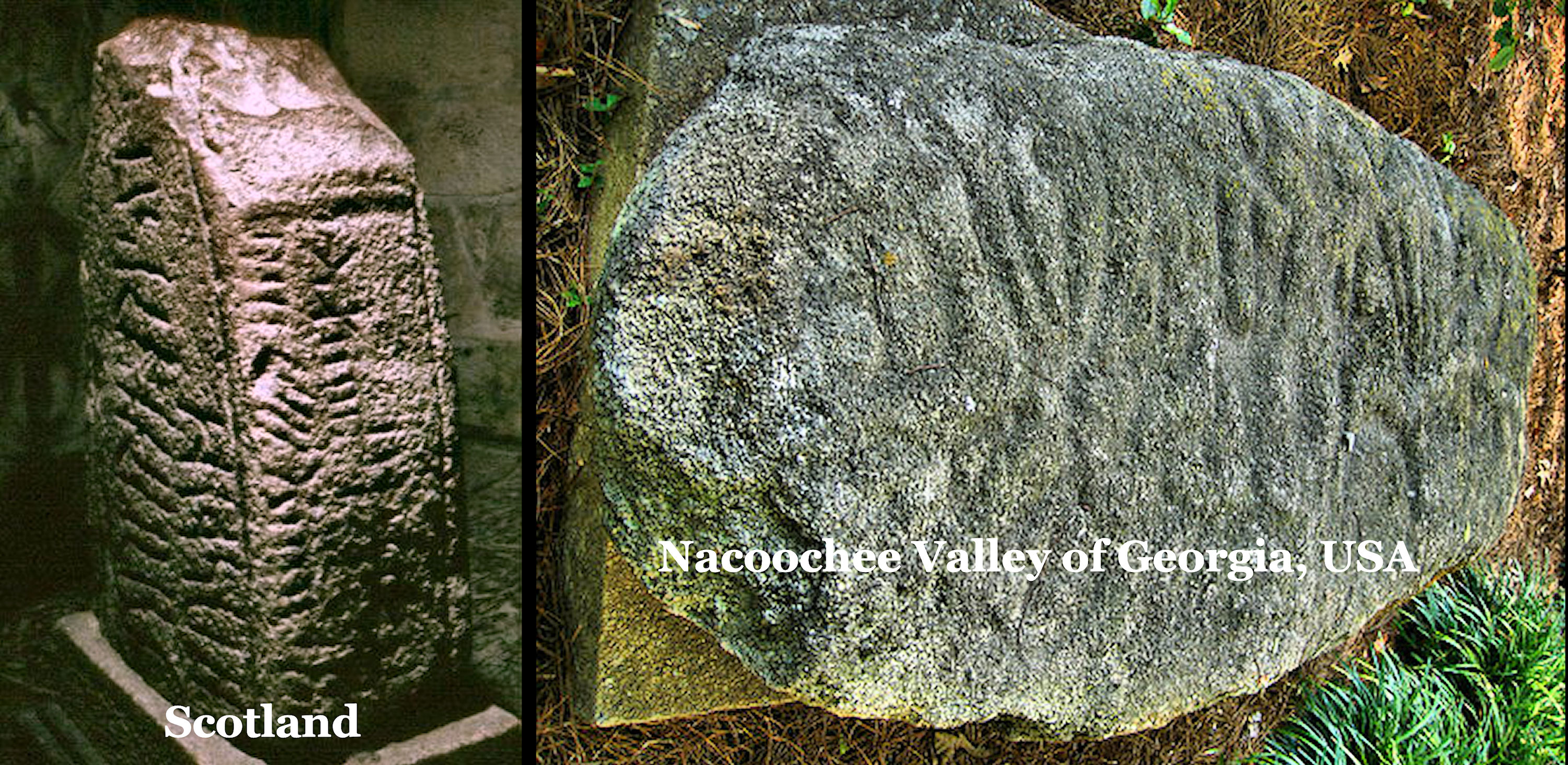 What is particularly intriguing about this petroglyphic monolith is that it is similar to the Bronze Age stelas in Scandinavia and Pictish of Scotland, which evolved over the centuries into Iron Age runestones. According to the Ninth Century Anglo-Saxon scholar, Venerable Bede, both the Picts and the Angles originally lived in southern Sweden. Note, however, that the Nacoochee Valley stela was sculptured into a symmetrical shape, whereas its contemporaries were monoliths that were merely erected and carved on.