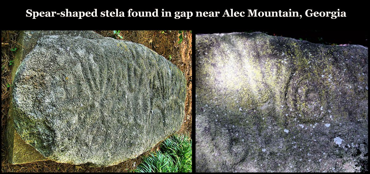 The Nacoochee Stela once stood beside the ancient trail between the head of trade canoe navigation on the Tugaloo River and the intersection of several trade routes in the Nacoochee Valley. The stela probably marked the boundary of a province. It is quite different in shape than the other petroglyphic boulders in the Georgia Gold Belt, even though it shares many of the same symbols. It is a quarried spear-shaped monument, not a potato-shaped boulder that always laid on the ground. The 12-feet (3.66 m) stone slab was carved from volcanic stone. It is now located on the campus of the university of Georgia.