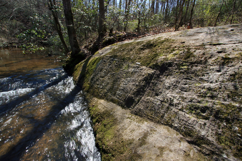 At all other petroglyph sites in North Georgia the symbols are arranged randomly and asymmetrically. These symbols are enclosed in rectangular boxes and on the left side of the carving are symmetrical both vertically and horizontally. The symbols on the right are badly eroded, but seem to resemble Maya glyphs. The purpose and meaning of these petroglyphs remain a mystery.