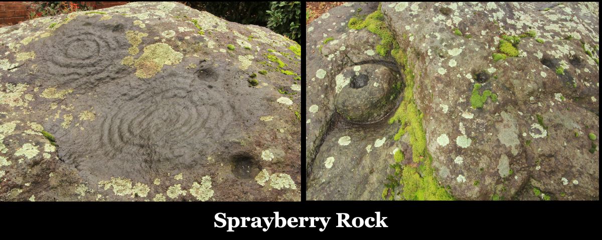 Although located in the Georgia Gold Belt, the Sprayberry petroglyphs are somewhat different than those farther north in the higher mountains of Georgia. There are several isolated mountains in northern Cobb County ranging in height from 1,808 feet (551 m) to 1292 feet (394 m). The boulder is soapstone and shows extensive evidence of soapstone bowls being carved from its flanks. Nevertheless, the boulder also has concentric circles and “cups” typical of the petroglyphs in the higher mountains and also Bronze Age Europe.