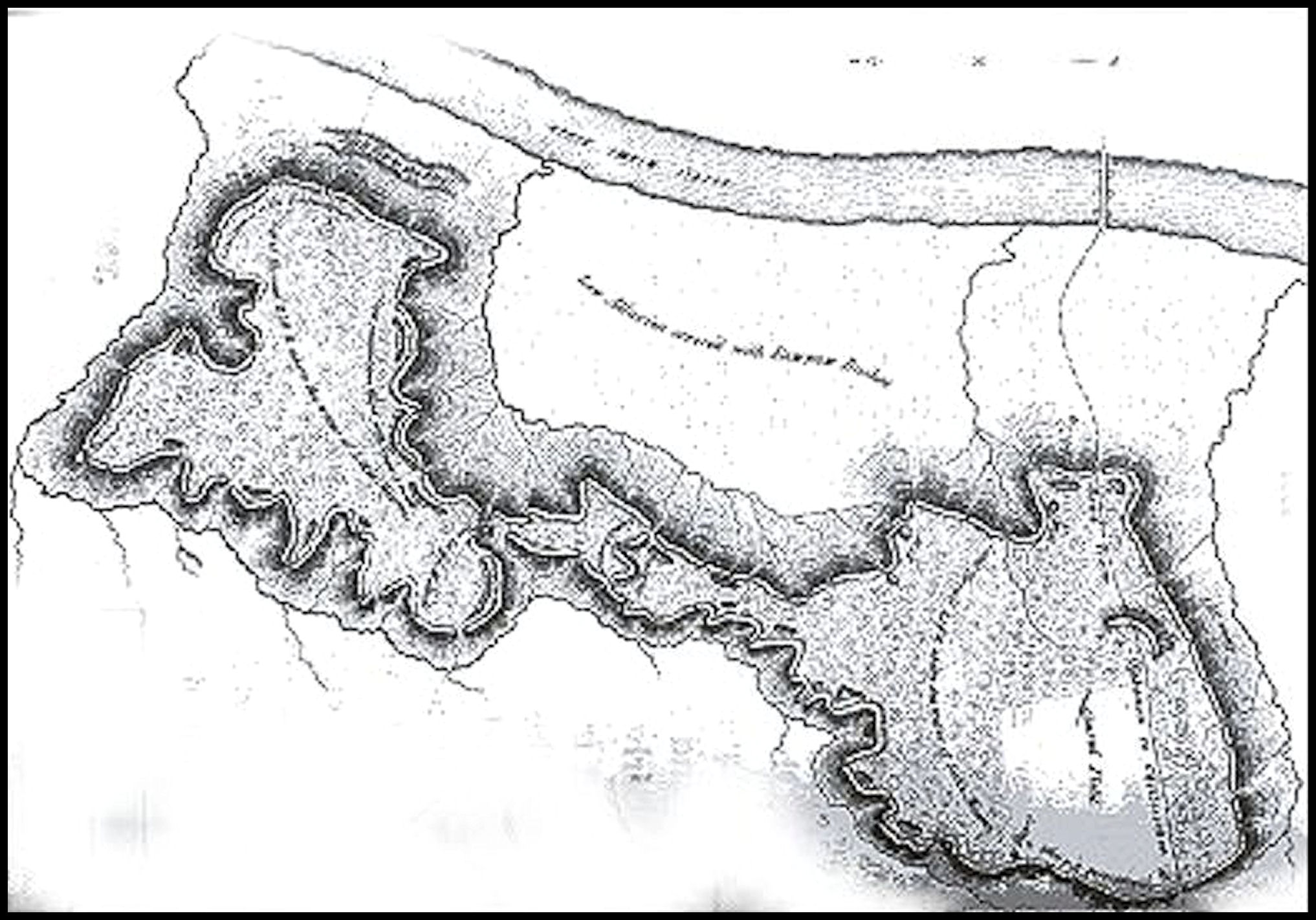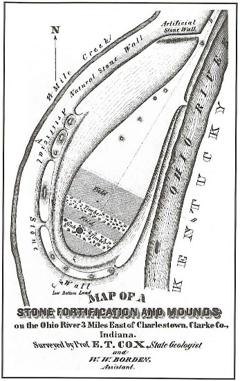 The earliest survey of the area, done in 1873 by state geologist E. T. Cox and his assistant, William Borden. They found a prehistoric stone fortification on the hilltop. A man-made limestone wall, 150 feet long and 7.5 feet high in some places, stood along the front and one side of the hill where the cliffs could be scaled, Cox said in his report. He estimated that there were visible stone foundations or walls of about 24 round and square buildings. The report also mentioned an area near the hill, which contained hundreds of human skeletons near the surface. It was described as an “Indian cemetery,” but could have been the scene of a massacre or plague.