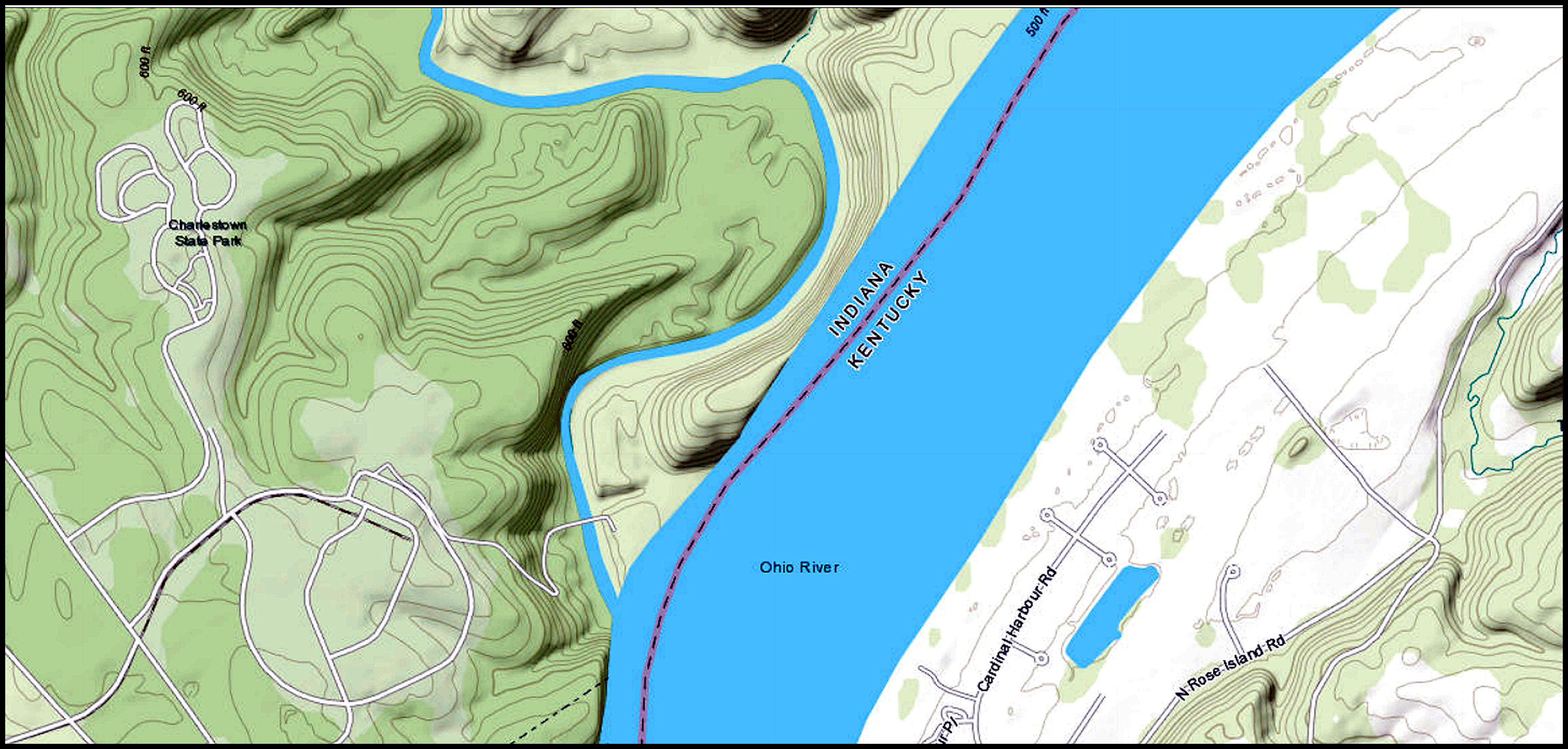 Devil’s Backbone is a sedimentary rock escarpment and peninsula formed by the flow of Fourteen Mile Creek into the Ohio River. The escarpment rises up to about 240 feet above the average elevation of the Ohio River. It is located within Charlestown State Park near Charlestown, Indiana and across the Ohio River from Louisville, Kentucky. This geological formation is believed to have been created by the processes of glaciation where a combination of ice sheet advances, meltwater flows and a diversion of the Ohio River left an isolated bedrock ridge remaining between two valleys.