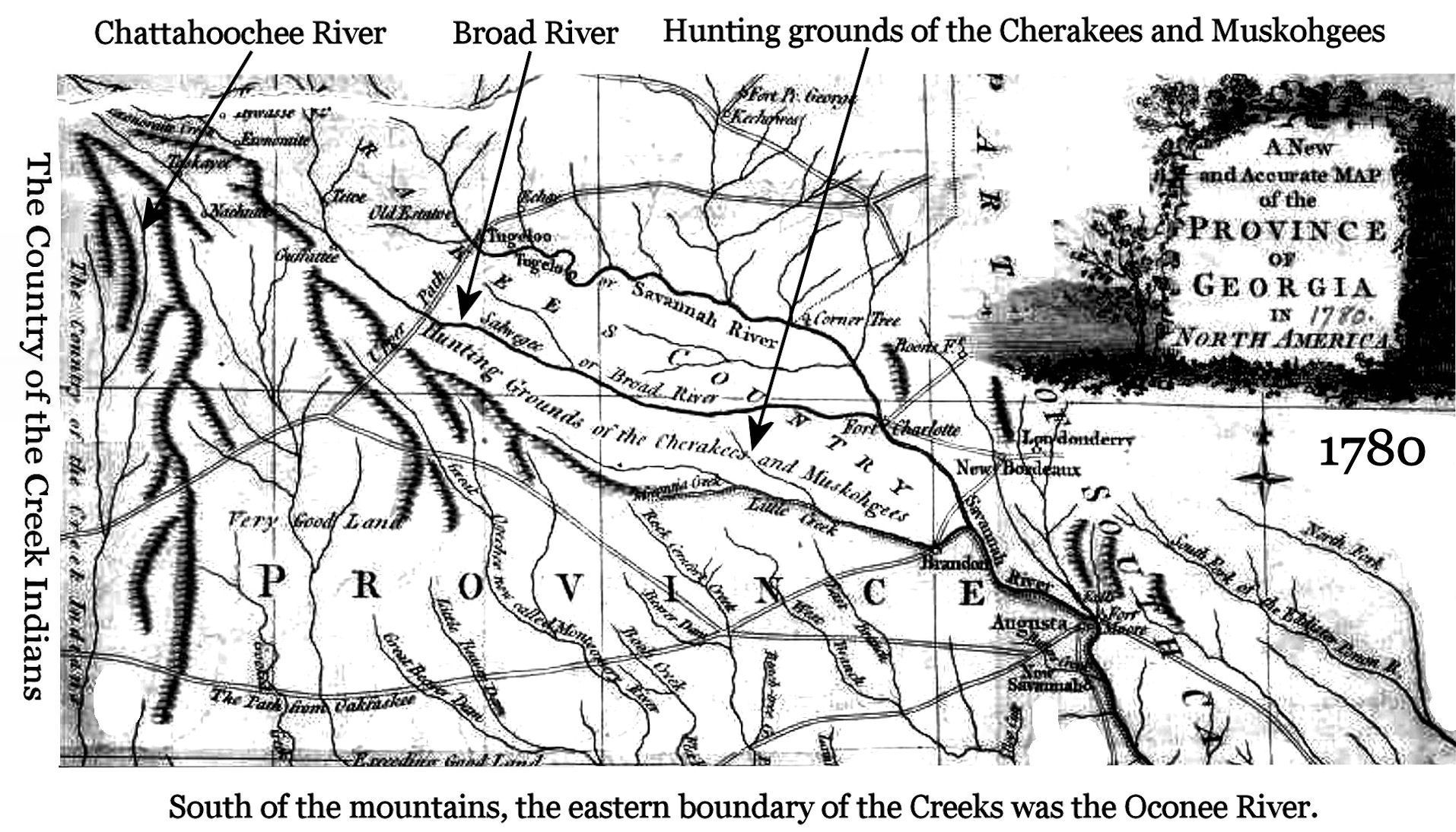 A North Carolina State Historical Marker in Otto, NC states that the southern boundary of the Cherokees in 1760 was Itsate Pass, which was a few miles south of the present North Carolina-Georgia state line. 1 William Bartram stated that in 1776, the sovereign territory of the Creek Nation began south of the Tallulah River, about 15 miles south of the state line. South of the Tallulah River, a hostile band of Cherokees could not pursue him. 2 As can be seen below, the official 1780 map of the Province of Georgia labeled the headwaters of the Chattahoochee River as the eastern boundary of the Upper Creeks within the Georgia Mountains. Both Brasstown Bald Mountain and Track Rock were in their territory.