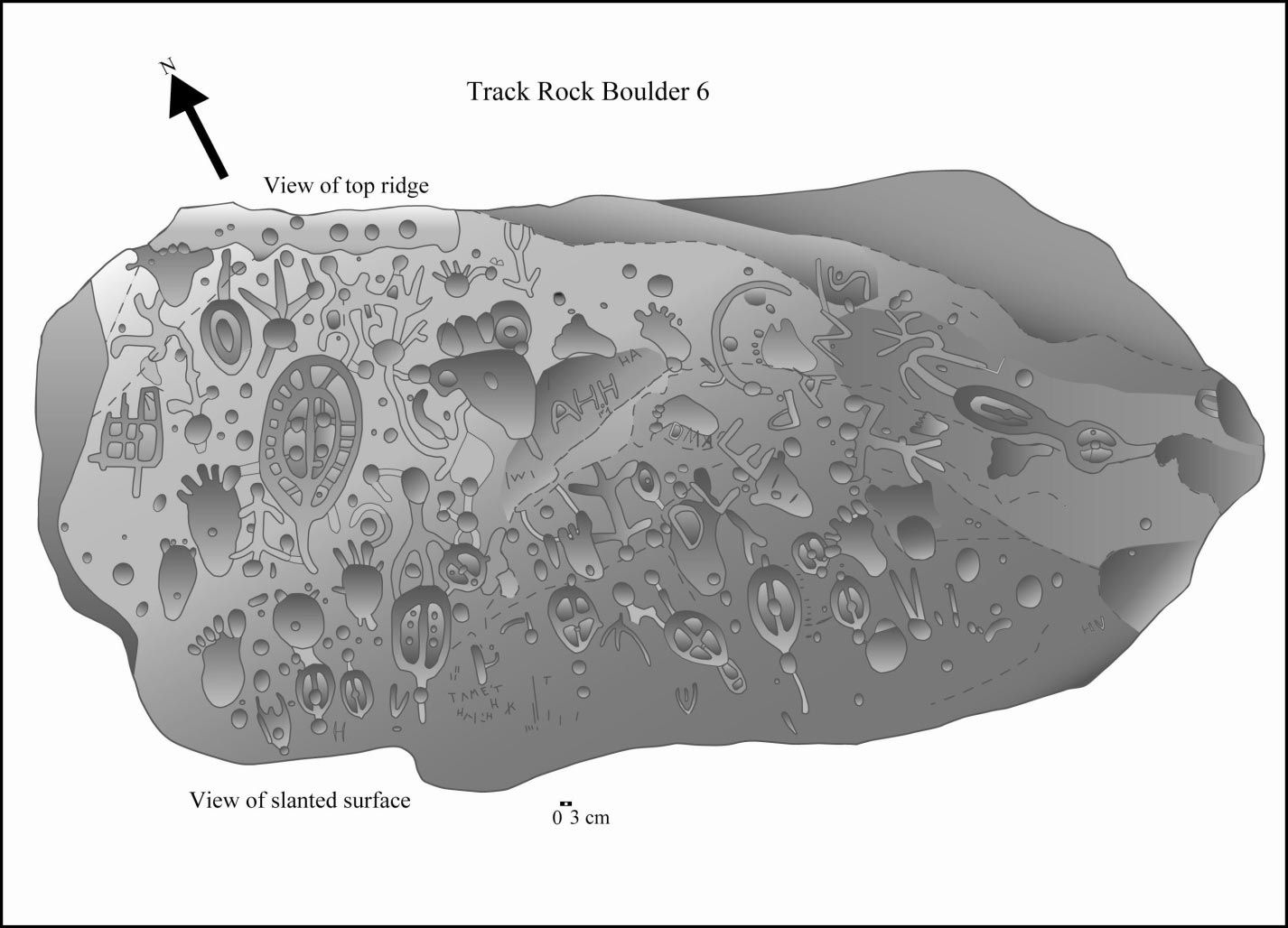 The Enchanted Mountain is a spur of this chain, about 10 miles north of it, and derives its name from a great number of tracks or impressions of the feet and hands of various animals in the rocks, which appear above its surface. The number visible or defined is one hundred and thirty-six, some of them quite natural and perfect, others rather rude imitations, and most of them, from the effects of time, have become more or less obliterated. * Stevenson apparently saw only one of the six petroglyph boulders.