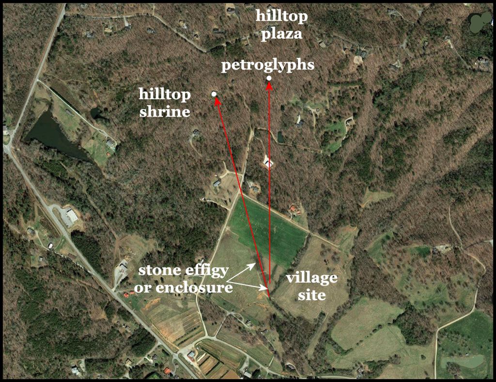The stone and earthen structures are clustered around the headwaters of Amy’s Creek, which flows into the Chattahoochee River, a few miles to the south. Pre-Columbian structures in this zone include village sites, petroglyphs, stone mounds, at least one large stone enclosure, stone circles, earthen mounds and a level, mountaintop worship area, oriented to the Winter Solstice Sunset. This archaeological zone is immediately west of the Alec Mountain Archaeological Zone, which includes the Alec Mountain Stone Oval and the newly discovered Arnold Mound and Amos Creek Burial Mounds.