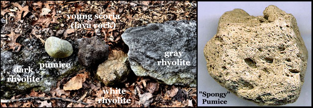 Geological History: Both the Amy’s Creek and Alec Mountain archaeological zones are located on the southern flank of an ancient caldera volcano. In fact, the entire northwest corner of Habersham County is a larger caldera, within which are lava fields, smaller calderas and eroded volcanic cones. All of the stones and rock strata . . . typically rhyolite . . . are volcanic, but much younger than the granitic rocks of the Georgia Piedmont, immediately to the south. The “sand” between the red subsoil and black topsoil is actually volcanic ash. On my property, I have also found lava bombs from fairly recent eruptions. They are black scoria, brown scoria or pumice. These lava bombs, along with the layer of volcanic ash, are very young rocks and are proof that at least one of the mountains to the north of the archaeological zone is dormant rather than extinct.