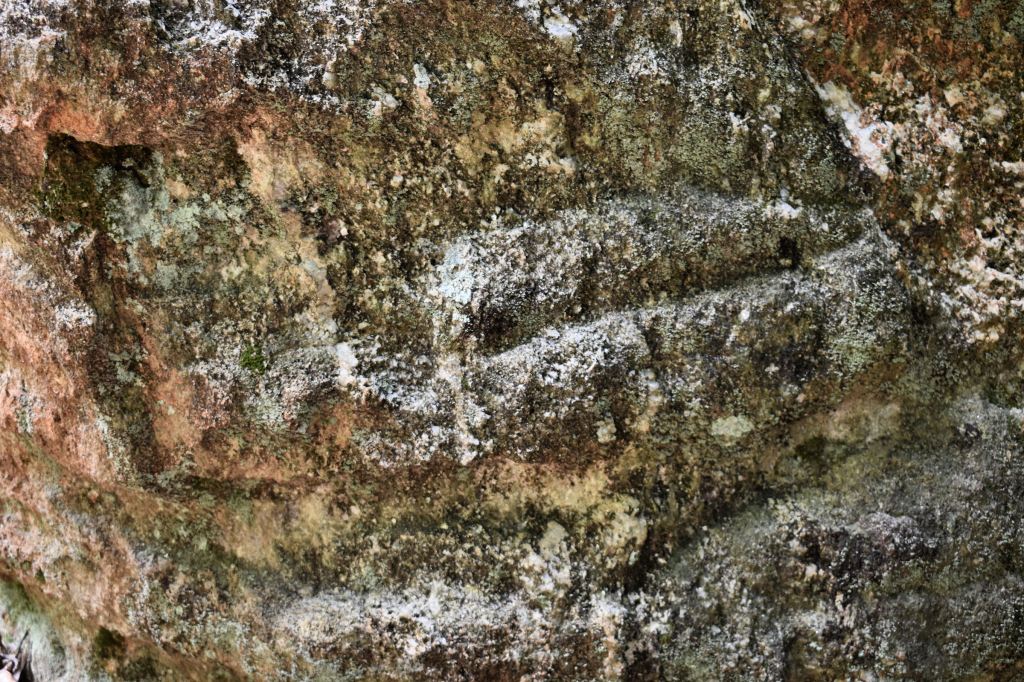 In early April, I found a large, enigmatic petroglyph boulder that is quite different than most petroglyphs in the Georgia Gold Belt. In fact, no Mexican archaeologist would bat an eye, if I showed him or her photos of the boulder and said it was from an Olmec Civilization site. The left side of the boulder carved face consist of horizontal lines crossing through a chevron pattern. The right side is a seated man with a headdress. Someone in the past chipped away the upper torso and head of the seated figure, but his hand, arm and bracelet are clearly visible, even today. The boulder is a coarse rhyolite with very sharp quartz crystals protruding from the surface. It is typical of that particular mountain.