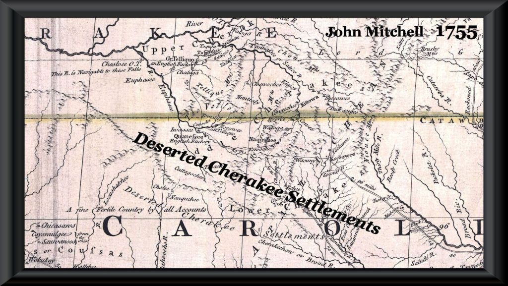 In Part One, we told you that in the autumn of 1754, soldiers from Koweta had devastated all of the Cherokee villages and towns, south of the Snowbird Mountains. The fourth linguistic division of the Cherokees, the Valley Towns, ceased to exist after 1754. Absolute proof of the Oklahoma professors’ findings can be seen on the 1755 John Mitchell Map of North America. The words, “Desserted Cherakee Settlements” is hand-written across a broad swath of Western North Carolina and the northeastern tip of Georgia.
