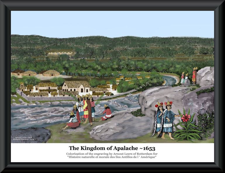 Survivors of Fort Caroline were allowed to settle in Apalache by its high king during the winter of 1566, with the condition that they take Native American wives. They founded the town of Melilot, which appears on European maps until the 1690s. At this time, according to 17th century French historian, Charles de Rochefort, the king’s vassal provinces stretched from southwestern Virginia to southwestern Georgia.