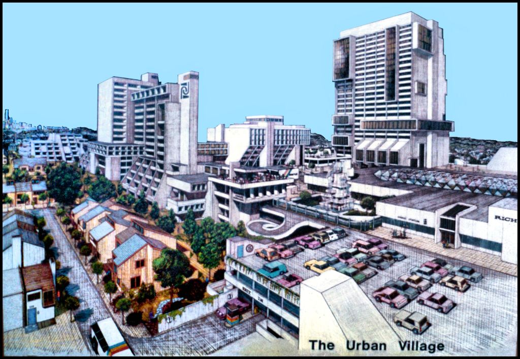 This was my concept for a multi-use complex at the Atlantic Steel property, south of Georgia Tech, which accompanied an article I wrote for Real Estate Atlanta Magazine in 1974. It is supposedly was the first use of the term “Urban Village.” Old fogie architects had proposed high-rise glass tombstones to be built over all the MARTA rapid transit stations. A similar project with simpler architecture was built on the site in the late 1990s.