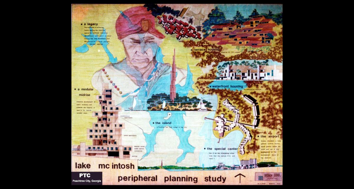 They also assigned me the task of designing a real downtown for PTC on a planned reservoir named after Creek Indian chief William McIntosh. The logic there was that a Creek Indian should design a downtown on a Creek-named lake that wouldn’t ever be built. Turns out that the developer had forgotten to buy all the land for the lake and the actual property owners were rather upset when massive machinery showed up on their land to clear trees, grade a reservoir and start work on a downtown.