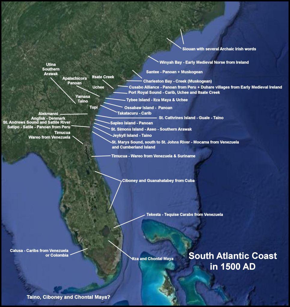Many of the Irish place names were “no brainers.” Kialege (written Kiare-ge) is what the people of County Kerry are called today. It is also a Creek tribal town in Oklahoma. Many place names were the same in both Georgia and locations “South of the Border.” For example, there was a Satipo Province in Peru and Satipo Province in Southeast Georgia. Both were ruled by a Sati-uriwa (king). There were orata (village chiefs) all over the place in South Carolina and Peru. There were heneha’s all over the place in the Maya lands and Georgia. Guadaquini was the indigenous name for Jekyll Island, GA. That’s the Taino word for a circular ceremonial space for dancing and feasting.