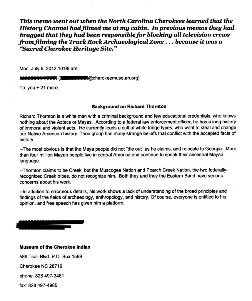 In early February, something very odd began happening. Somehow, the email address I used in 2006, when acting president of the Georgia Trail of Tears Association had gotten thrown into the list of email addresses, belonging to the conspirators. I started receiving emails addressed to the Georgia Trail of Tears Association from all the conspirators in the Maya Myth-busting in the Mountains Political Campaign. They included: (1) US Forest Service offices and federal law enforcement personnel in North Carolina, Gainesville, Atlanta and Washington, DC (2) Eastern Band of Cherokee Indians Cultural Preservation Office (3) Cherokee Nation Cultural Preservation Office in Oklahoma (4) United Keetoowah Cherokee Band in Oklahoma (5) Muscogee-Creek Nation Cultural Preservation Office in Oklahoma (6) Georgia Council of Professional Archaeologists (7) Society for Georgia Archaeology (8) Georgia Republican Party (9) Mike Torpy of the Atlanta Journal-Constitution (10) Georgia Trail of Tears Association*