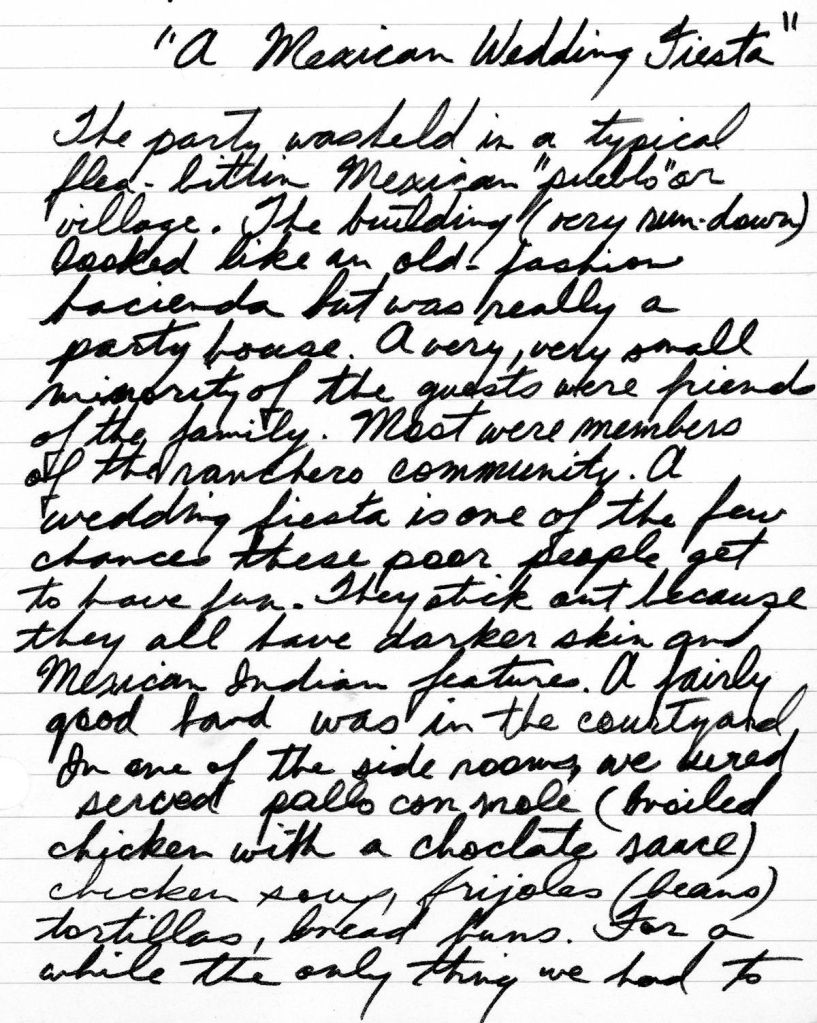After the older folks began drifting away, the band started playing music for slow dancing. The younger couples like ourselves began dancing very close to each other . . . but I must admit, not with the grace of those of us Gringos who had spent many a Saturday night at a high school sock hop or a fraternity. Alicia went and got another whiskey and soda then chugged it down. Her skin became very soft and warm, but she still was not really drunk. Her conversation was quite lucid. I wrote in my journal, “It was while dancing with Alicia that night that I first felt truly in love with her. Our souls melted together as the band sang traditional Mexican love songs.”