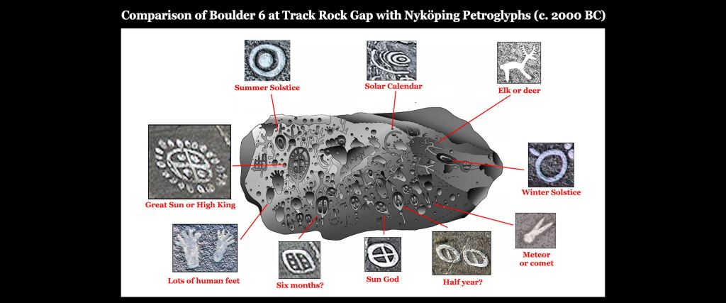 Most of the symbols on the six boulders of Georgia’s famous Track Rock Petroglyphs can also be found on a rock face in Nyköping, Sweden.  Those at Nyköping have been dated to 2000 BC.  In a sad reflection of the current state of anthropology education in the United States . . .  during 2012 the Georgia Council of Professional Archaeologists endorsed a report that interpreted the Track Rock Petroglyphs to be “grafitti carved by bored Cherokee hunters.”  French and Dutch colonial archives place the Cherokees on the St. Lawrence River in Canada until 1650.  Track Rock Gap was not in Cherokee territory until 1785.