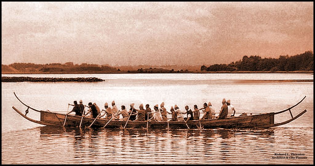 A hjortspringer boat enters the mouth of the Savannah River