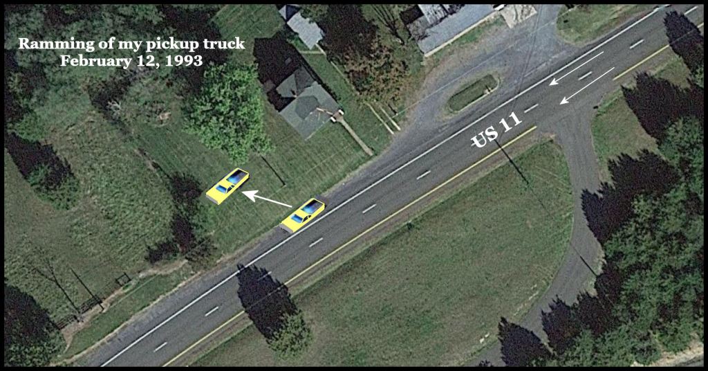 February 12, 1993: I was driving back from a project site near Strasburg to our farm, when two young men in the back of a pickup in front of me appeared to push a sofa from the truck bed onto US Hwy. 11. In this part of the highway there were bifurcated one-way lanes. (see map) I steered my truck onto the road shoulder, which was at least 10 feet wide.