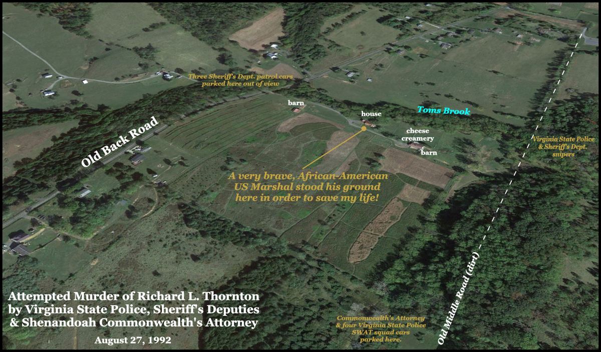 Once we were in the front yard, he pulled out a US Marshall’s badge. He said, “Did you know that there are some Virginia state cops back there next to the woods, who are planning to kill you in few minutes. Call your auto repair shop and tell them not to bring the door out here.” I did that and then returned to the front yard.
