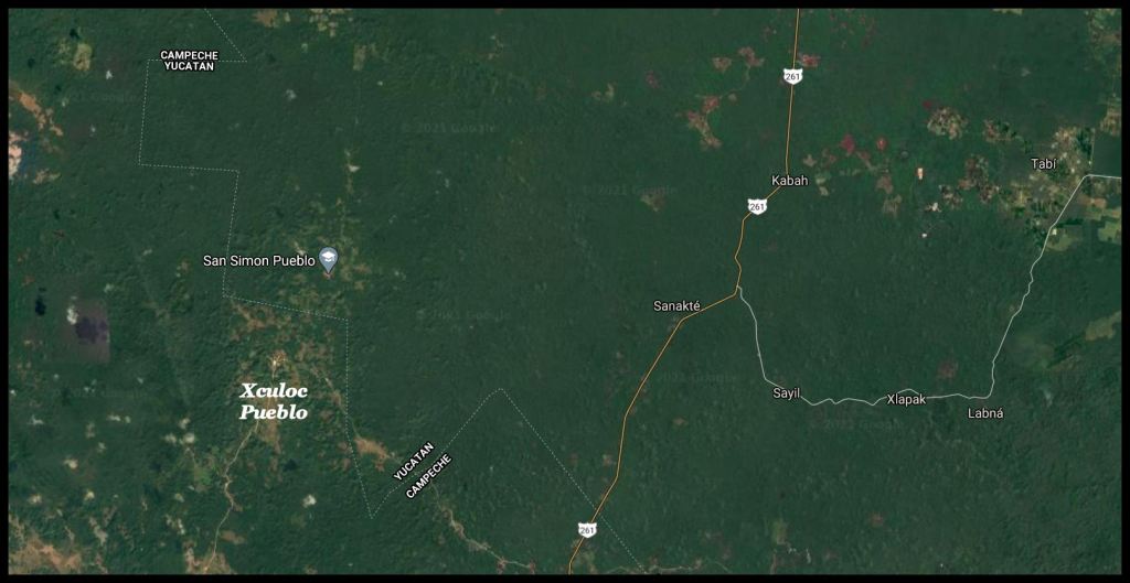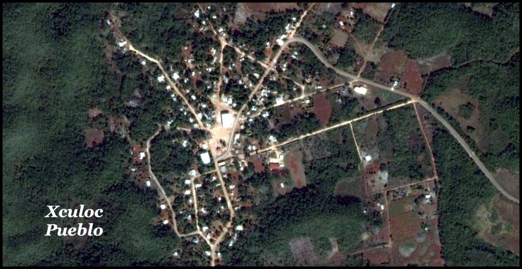 I was able to find Xoculoc on Google Maps. One can still make out the ancient oval plaza, but the architectural character of the village has changed radically. Almost all structures have metal roofs. A paved two lane road passes through the old plaza then connects the village to a paved two-lane state highway. A hexagonal zocalo has been constructed in the southeast section of the old oval plaza. A large, metal roofed structure, perhaps a church, has been constructed in the northern end of the old oval plaza.