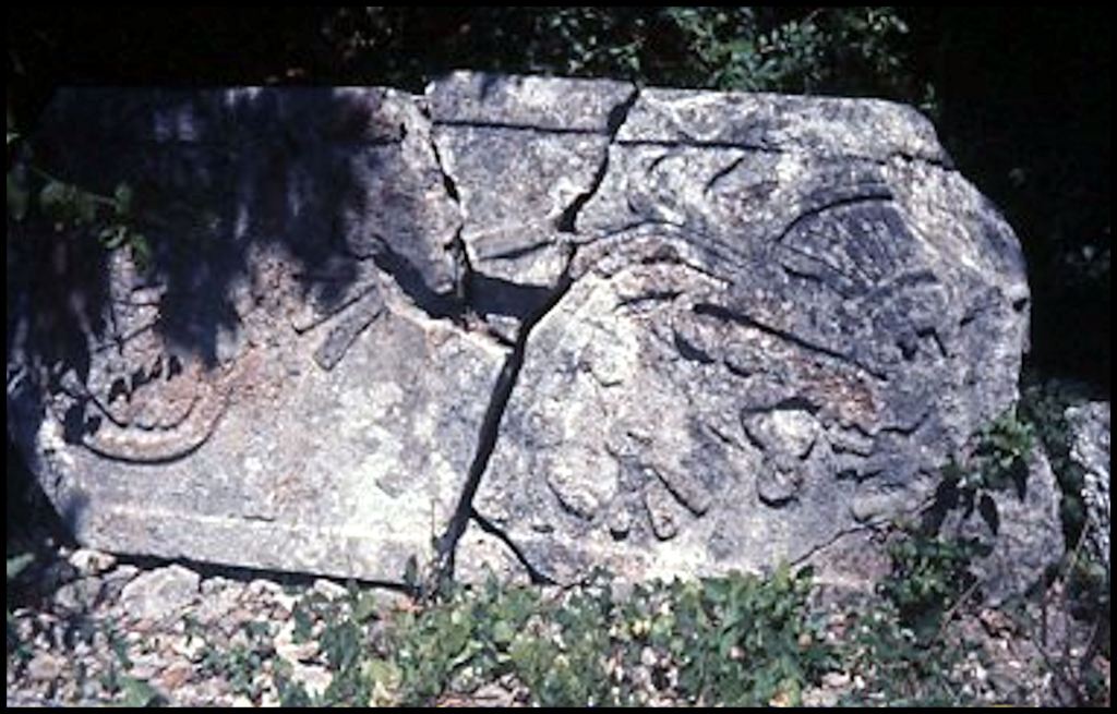 This partially carved stone was among plain stones in a collapsed building in the jungle. We were not sure what it portrayed because it seemed to have been intentionally vandalized.
