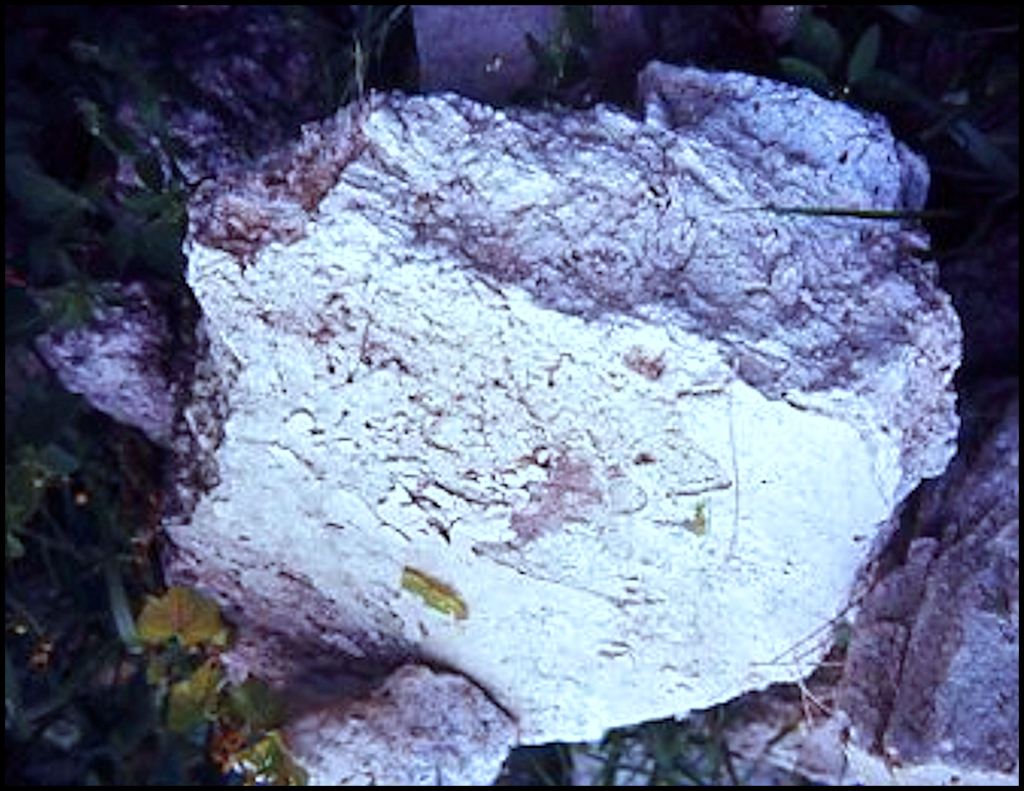 Magnified piece of Totonac concrete illuminated with ultraviolet light. Note the air holes in the concrete. This is called “air entrained ” concrete today. The lighter the color, the greater the percentage of calcium.