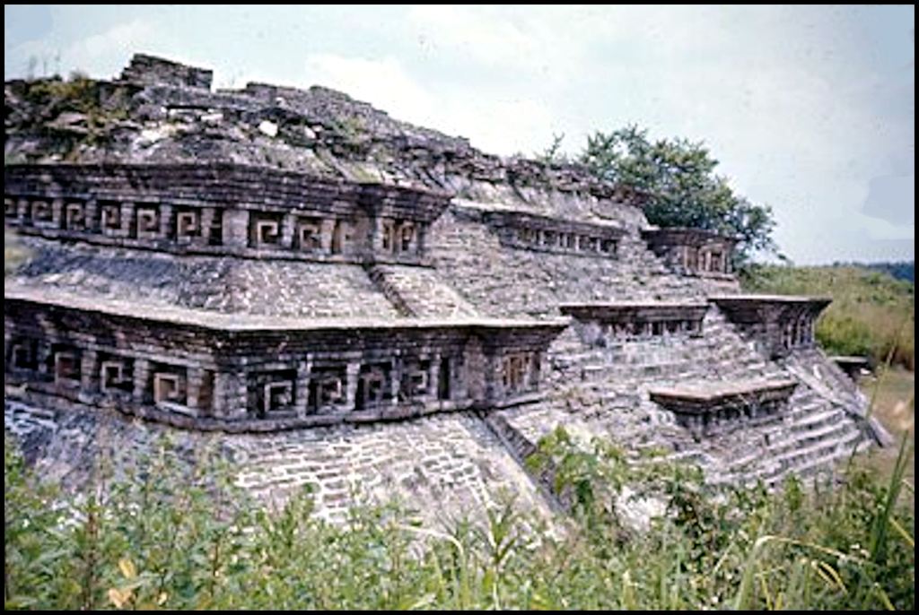 • Unlike most other Mesoamerican peoples, the Totonac architects designed ornate details on the faces of pyramidal bases for temples.  The most striking features are eaves that protrude out from the sloping surfaces.