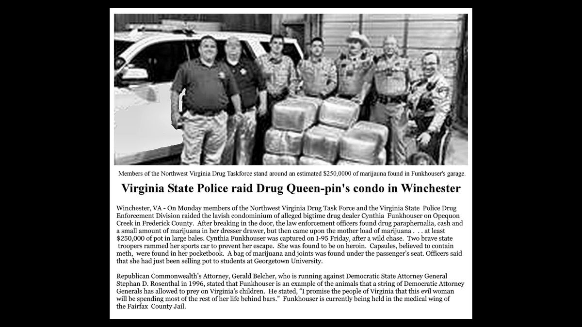 December 19, 1994: Members of the Northwest Virginia Drug Task Force broke down the front door of her condominium. They found about a tablespoon of pot in a plastic bag in her dresser drawer, cigarette paper, plus several cigarette lighters around the house. Even in the severe laws of the 1990s, that was only good for a misdemeanor conviction, resulting in 30-60 days in jail and a $5000 fine. Before notifying the media of the raid they had several large bales of fake marijuana hauled in from a warehouse near Centerville, VA. The bales were stacked in Cynthia’s garage.