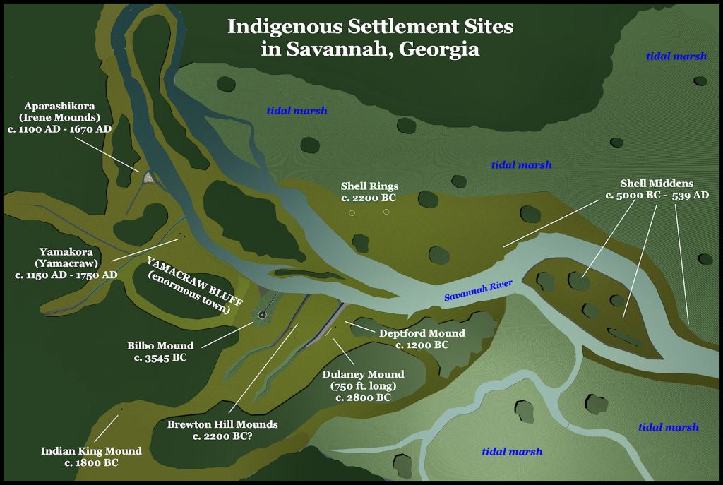 Tamachichi (Tomochichi in English) was somewhat of a real estate scam artist . . . in addition to being the deposed king of the Itsate towns on the Ocmulgee River, near present-day Macon, GA. When he heard that the British planned to found a new colony on the uninhabited site of Yamakora, Tamachichi gathered together approximately 50 multi-tribal followers from the town of Palachicora, which was now about 35 miles upstream from the original location. They built their village near some burial mounds on Yamacraw Bluff in what is now the northwest corner of the Downtown Historic District. That neighborhood is now called Yamacraw Village.