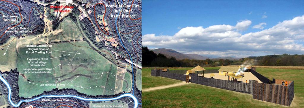 The Apalache moved northward and apparently were the founders of the great town that is now called Ocmulgee Mounds. It was at this time that nearby “Indian Springs” became sacred to them and subsequent Creeks. Upon the arrival of many people from Mexico at the Ocmulgee capital the Apalache began moving northward, building new capitals along the way. They eventually concentrated their villages along the Apalachee, Mulberry and North Oconee Rivers. At this time, they were the most powerful of the vassals of the Itsate, whose capital was in the Nacoochee Valley.
