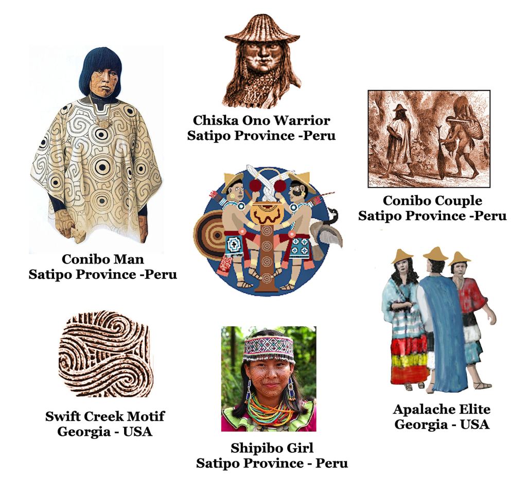 The closely related Shipibo People create clothing and paint geometric designs on their faces, which are identical to the Napier Pottery Style, which followed the Swift Creek Style.  The names of both tribes appear as place names in northern Georgia, eastern Tennessee and western North Carolina.  There is no doubt about it.
