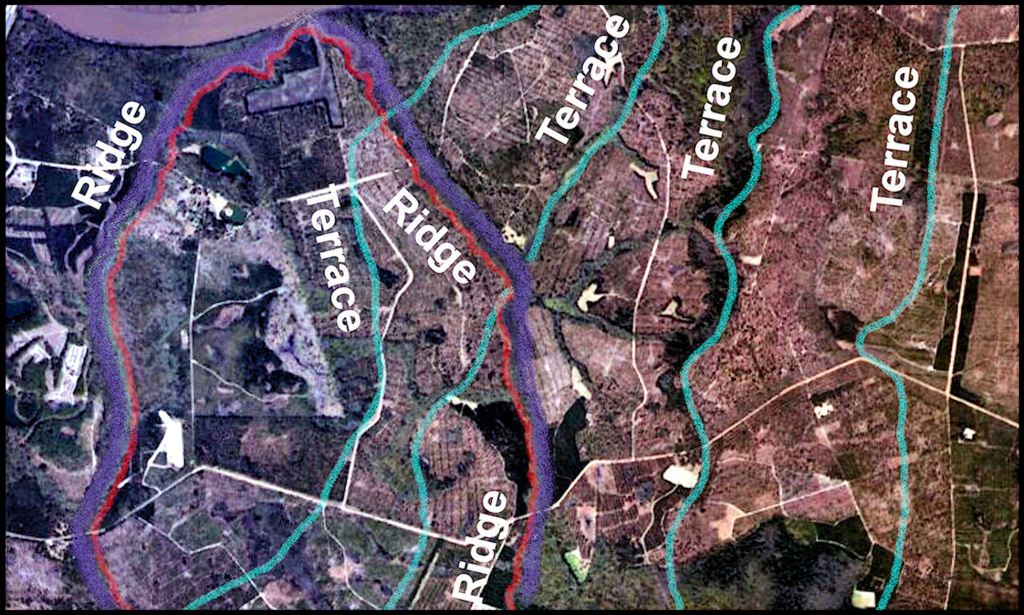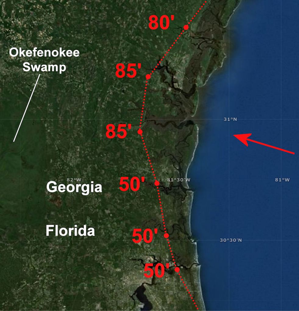 As a young boy, growing up in Waycross in Southeast Georgia, I remember distinctly a tall ridge that seemingly rose out of nowhere, about 11 miles west of the edge of the tidal marshes at Darien, GA.  While searching for the actual site of Fort Caroline (1564-1565) I sought a location that was 11 miles west of Altamaha River’s mouth and had a view of a “small mountain” as Fort Caroline’s Commander, Captain René de Laudonnière described.  I discovered that a sandy ridge, 85 feet tall at Darien, extended from Savannah to south of Jacksonville, FL.  The bluff on which Downtown Savannah is constructed was the tail end of the ridge.  It was obviously a tsunami debris ridge, but not ONE geologist had ever noticed its existence . . . at least enough to discuss in writing.