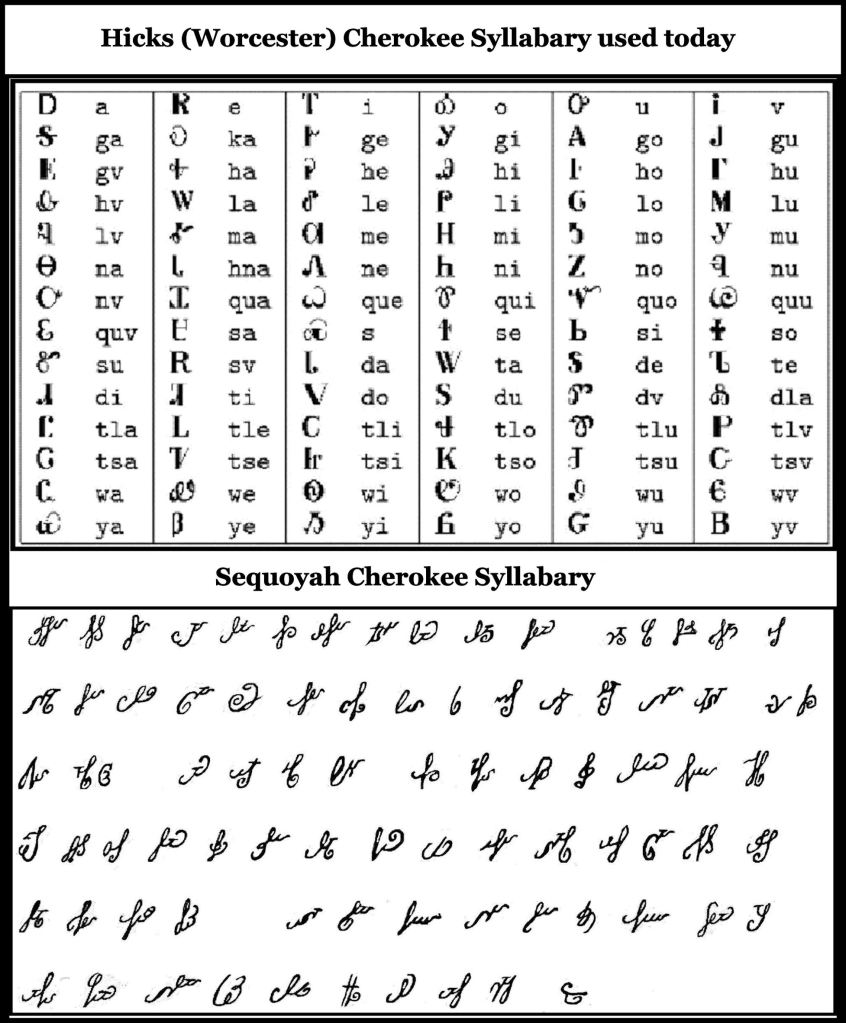 From 1826 until the 1920s, what is called today “The Sequoyah Syllabary” was called “The Hicks Syllabary.” Charles Hicks was a comrade of George Gist in the Chickamauga Cherokees. Some of the few survivors of the Battle of Etowah Cliffs, they fled to Pine Log, GA together and remained friends. However, Hicks realized that the complex glyphs, created by Gist (Sequoyah) would be difficult to learn and print on a press. After Gist had moved out west, Hicks worked with the Rev. Samuel Worcester and Elias Boudinot to re-design the symbols. It is doubtful that Gist would be able to read the Hick Syllabary. Worcester continued to simplify and modify the syllabary until his death in the 1850s.