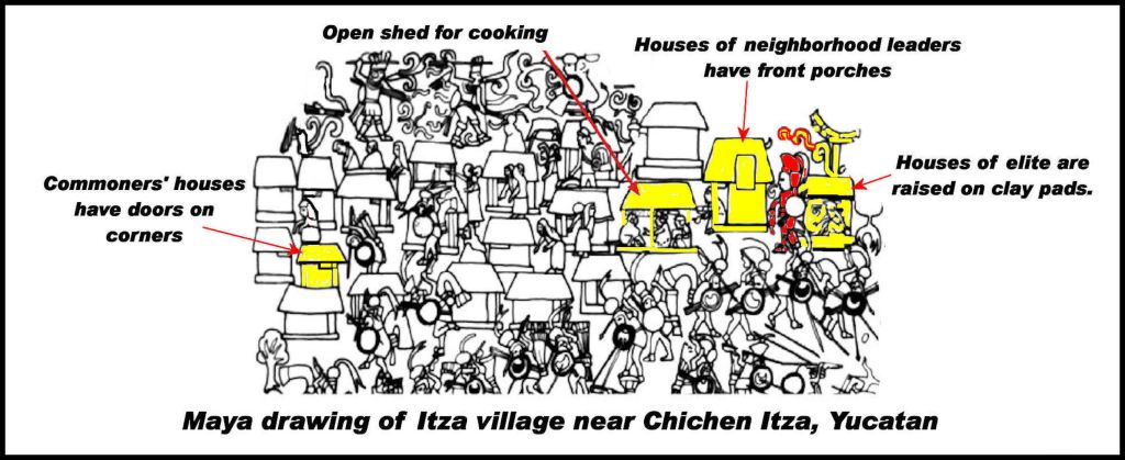 (See architectural rendering of Etula and section of Chichen Itza Mural above) Between around 810 AD to 990 AD, the predominate style of house for the commoners in the suburbs of Chichen Itza was a square, wood framed, wattle & daub wall structure with a door in one corner. Within each neighborhood or suburban village was a different type of house. It was rectangular and had three rooms. Typically, one or two rooms had exit doors, which opened upon a covered porch. All houses had open sheds for kitchens. A few larger, rectangular houses were raised on clay pads, aka low mounds, which indicated their higher political status.