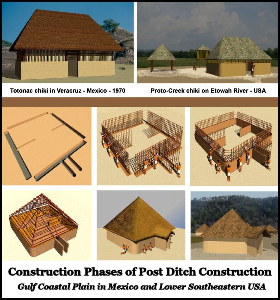 Radical changes in the architecture in the Chickasaw and Creek People’s homeland provide strong evidence of where these Mesoamerican refugees settled, after being driven out of their homelands. First of all, here are drawings that explain how the houses were built . . . both in Southern Mexico and in the Lower Southeastern United States.
