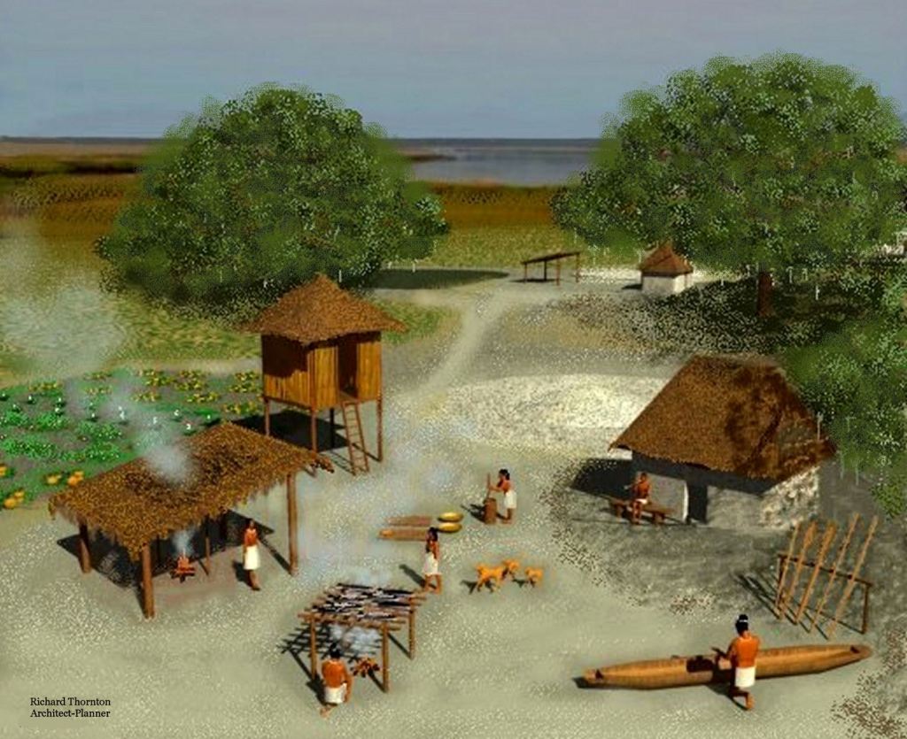 A Spanish engineering officer described the traditional construction of houses and public buildings among the Wahali (Southerners) who the Spanish called Guale. The buildings were framed with timbers then the walls were filled with saplings and vines, woven like a basket. The word, chiki (house) is derived from the Maya word for a basket. River clay was packed around the timber frames and woven wall reinforcements. The builders then heated sea shells to make hydrated lime. This was mixed with water, sand and crushed oyster shells then applied as an inner coat of stucco, which dried rock hard. The rough stucco coat was then finished with a plaster made from white clay (imported by freight canoe from about 125 miles inland on the river) sand, hydrated lime and crushed white sea shells. After hardening the finish coat was also rock hard and “glistened like pearls.” This stucco would enable walls to withstand the most violent of ocean storms, even if the thatch roofs were blown away.