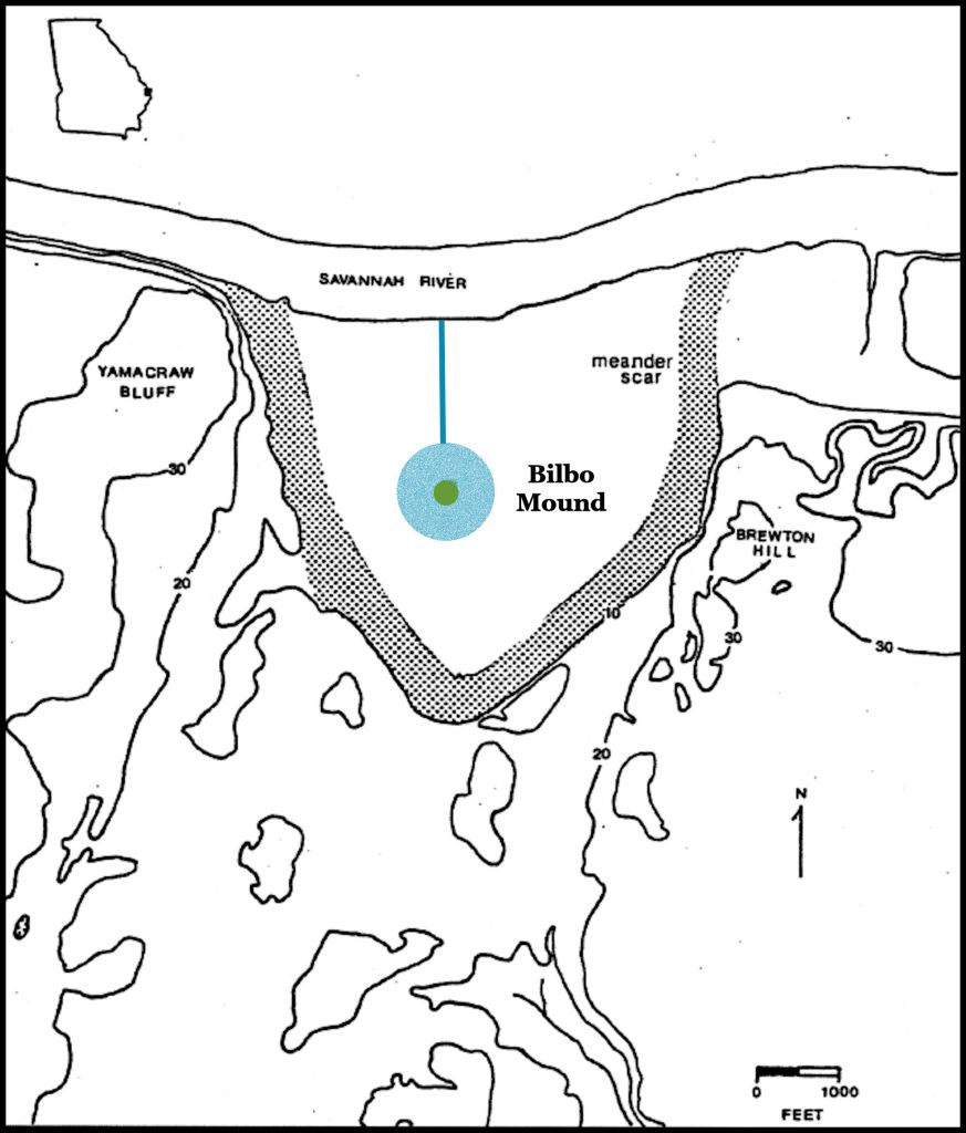 The center of the Bilbo Mound is located approximately 2,300 feet (701 m) south of the Savannah River and approximately 3000 feet (914 m) east of the Downtown Savannah National Historic District. It was originally a seven feet high man-made island, but became an accretional burial mound that gradually increased in diameter and height over time.