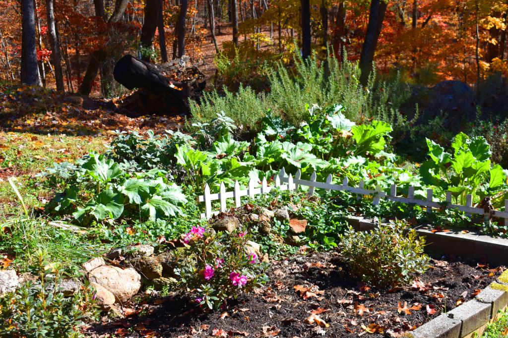 The section of my garden devoted to flowers, rhubarb, strawberries, rhubarb, sage and rosemary.