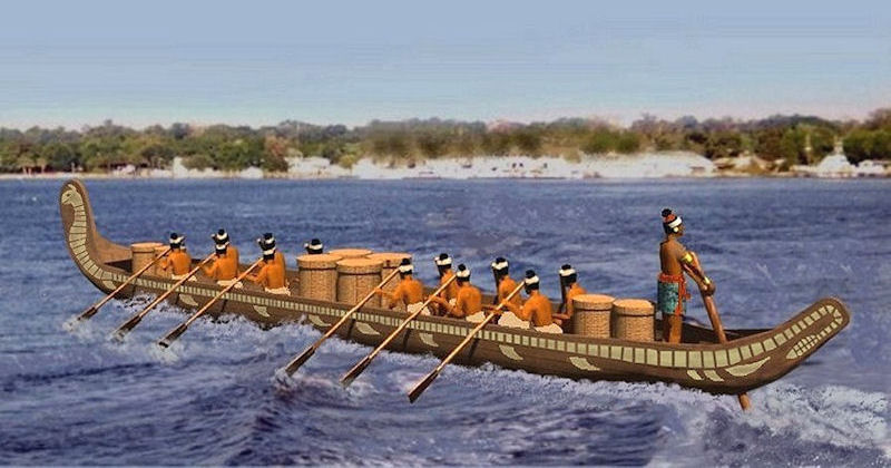 Image Above: A Chontal Maya ocean-going sailboat was about the same construction and size as a Scandinavian långbåt. These sea crafts were capable of going anywhere a långbåt could go, but had the advantage that the sails, woven from split river cane, would never rot like the Vikings’ woolen sail cloth or rip, when struck by fierce winds.