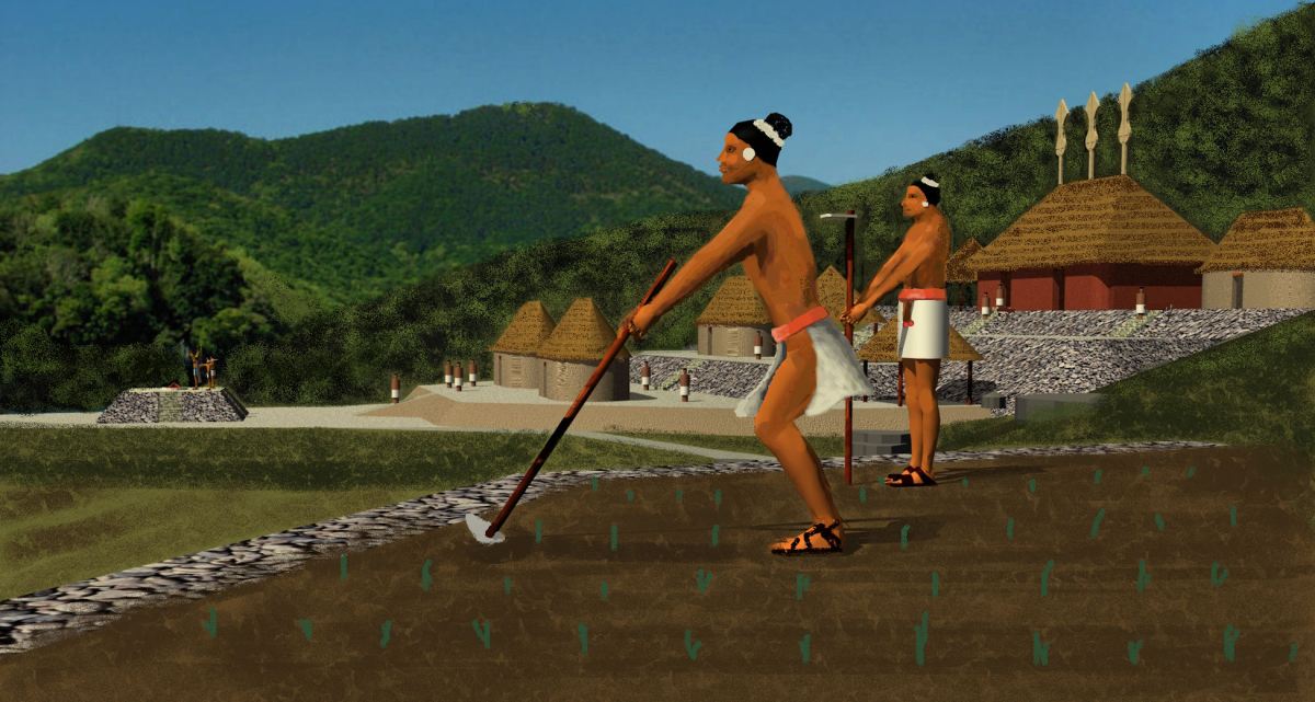 Loubser’s work was severely restricted by his available budget, but his discoveries “opened up the door” for future archaeological investigations. His firm dug two test pits under stone structures to obtain soil samples. In conjunction with the highly respected archaeological firm of New South Associates in Stone Mountain, GA he obtained radiocarbon dates for the oldest layer of fill soil in a test pit, going back around 1000 AD. He also found pottery shards from many periods of history. Loubser estimated that some of the shards were made around 760 AD – 850 AD. This is exactly when Maya population began to plummet.