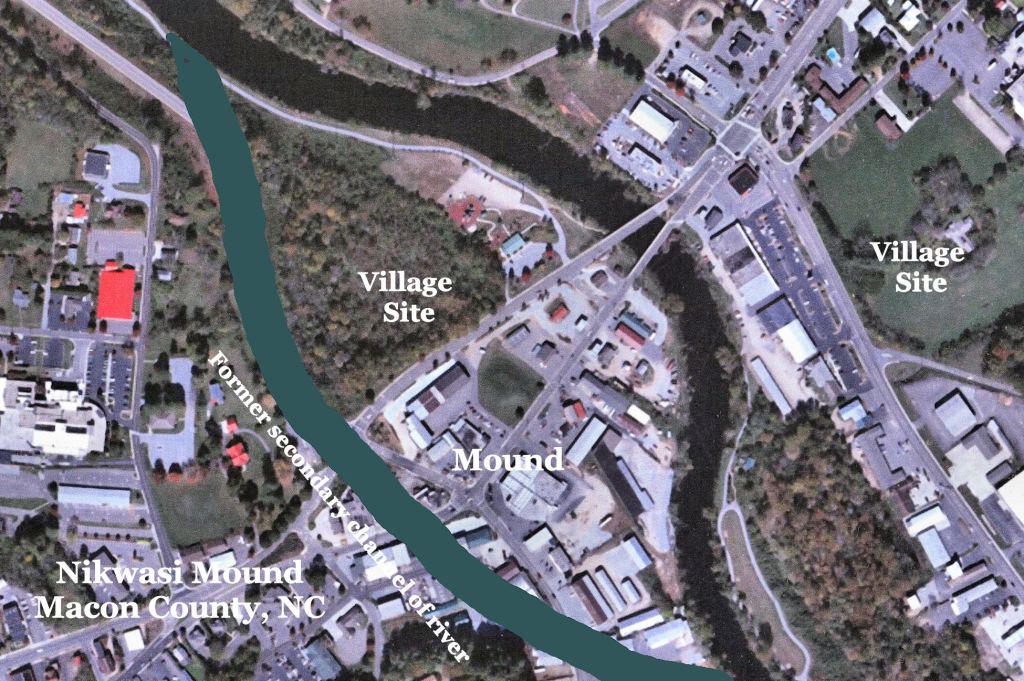 USGS satellite image of neighborhood around the Nikwasi mound. Note that in my soil and terrain analysis, I discovered that the Native American village was on an island up to fairly recent times. There was also a village on the eastern bank of the Little Tennessee River. North Carolina archaeologists are not aware of these facts.