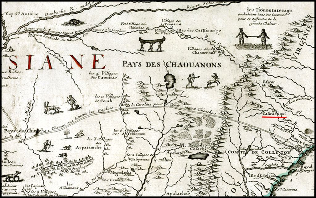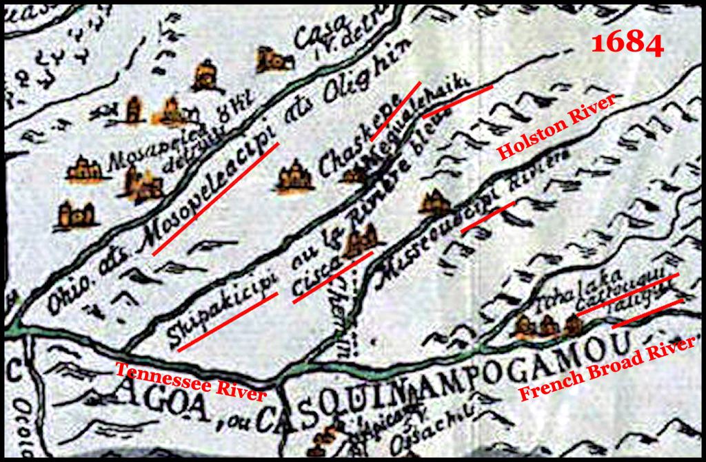 2c. The 1684 map of North America by Jean Baptiste Franquelin placed Kituwa on the upper Holston River in either SW Virginia or NE Tennessee – not in its current location in North Carolina.