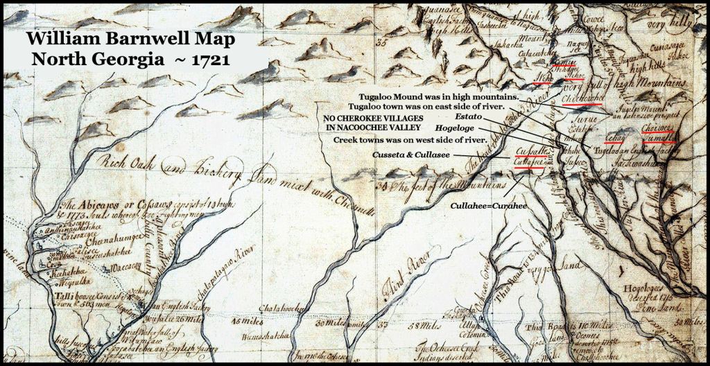 1b. Barnwell’s 1721 Map of South Carolina placed Nikosi where it is today and Nokose in the Nacoochee Valley of Georgia.