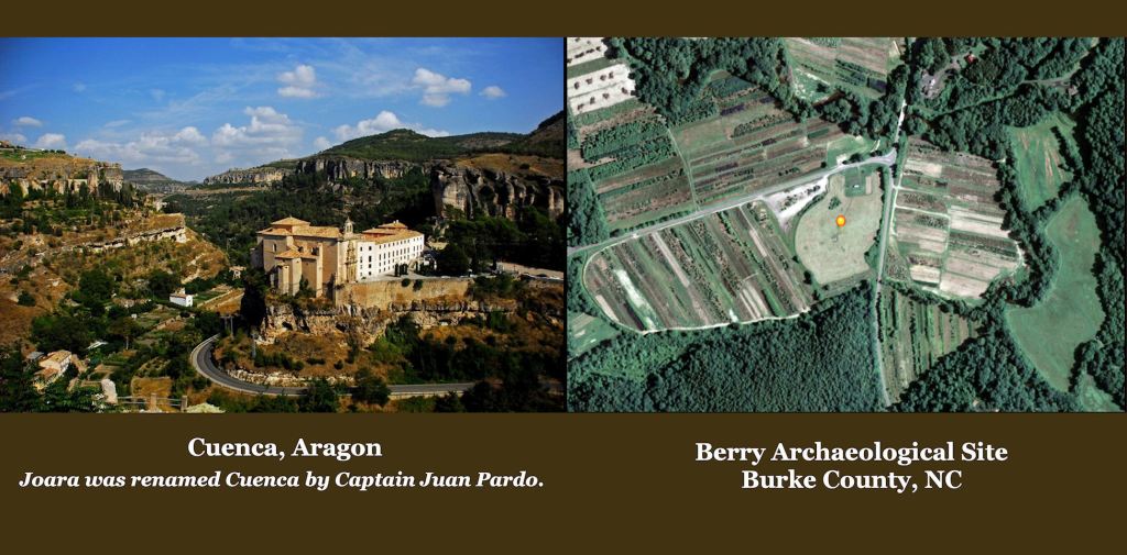 7- Joara was a large, politically powerful town in a gorge at the edge of the Blue Ridge Mountains Escarpment with many temples, plazas and streets. It was adjacent to a river and downstream from the convergence of four fast running rivers. It was subscribed by Juan Pardo as looking like his hometown of Cuenca, Spain.