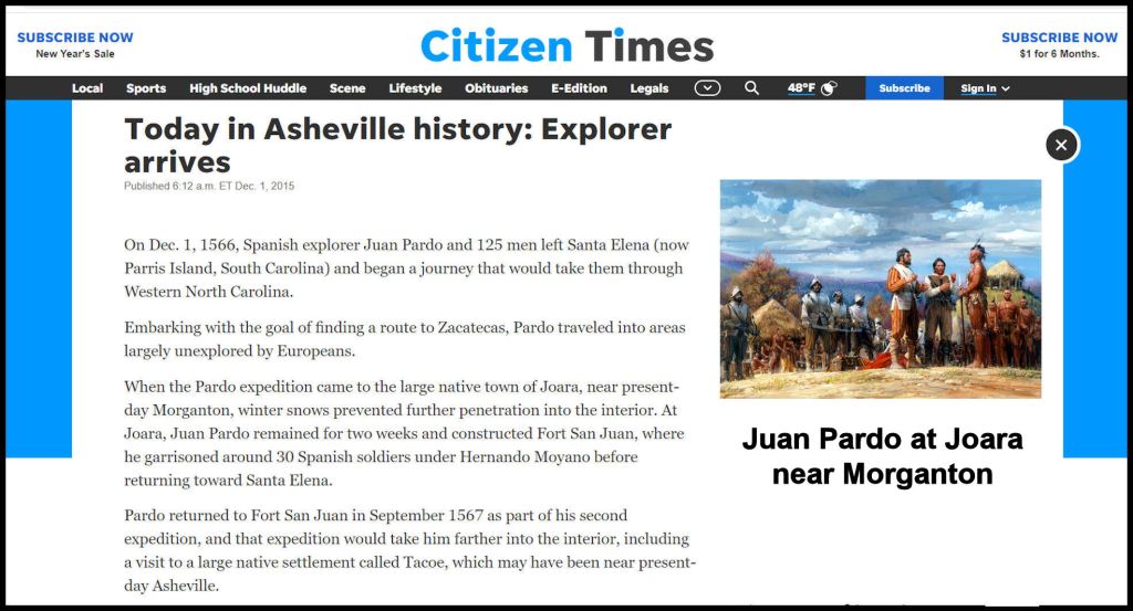 Supposedly, he stopped at a large, culturally-advanced town named Joara at the edge of the mountains, because the trails were blocked by snow. He built a fort there then returned to Santa Elena (Parris Island, SC) on March 7, 1567. Yet . . . he spent the entire winter in the Appalachian Mountains the following year. Juan de la Bandera did not once mention snow or difficulty in winter travel.