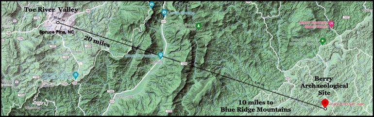 Climb the first ridge and you come down into a gorge.  Climb the next ridge and you come down the extremely steep slopes of Linville River Gorge. There is no way that the 300 horses and riders could have crossed the smaller gorge then 2,800 feet (853 meter) deep Linville Gorge in four hours.  De La Bandera said that the capital of the Tokah was on the other side of the mountain ridge.  On the other side of the ridge is the Toe River Gorge.  There is no place to cultivate large fields of crops in the Toe River Gorge.  Spruce Pine, NC is 20 miles from the Berry Archaeological Site.
