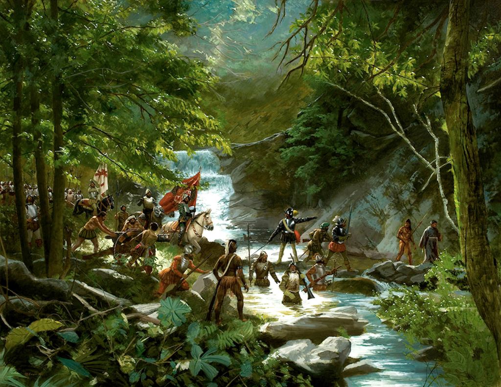 Captain Juan Pardo arrived in the new Spanish colony of Santa Elena in 1566 to take command of its garrison and supervise construction of Fort Filipe.  In December he led a company of 120 soldiers to explore the interior and demand submission of the Native American provinces, towns and villages to the King Filipe II of Castille and Aragon (Spain).