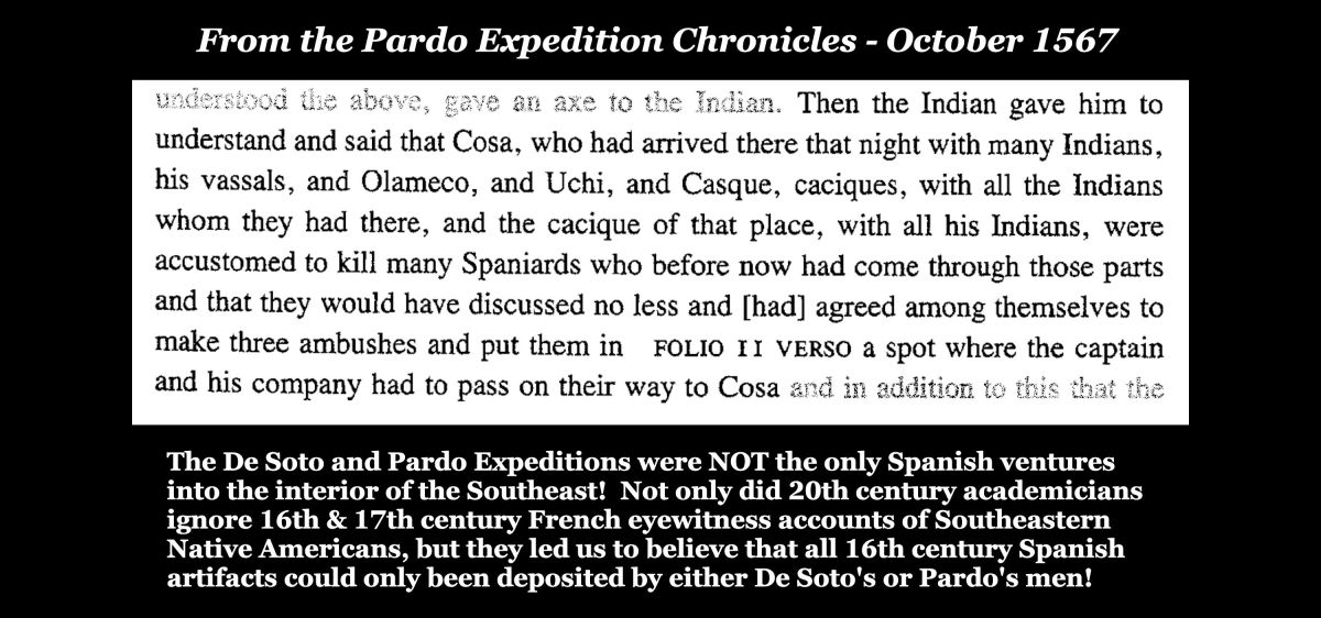 Members of the De Soto Expedition were not killed by the Natives in the Little Tennessee River Valley.  This means that there were several expeditions into the Southeast’s interior that have been overlooked by academicians or else were not recorded in the Spanish Colonial Archives.