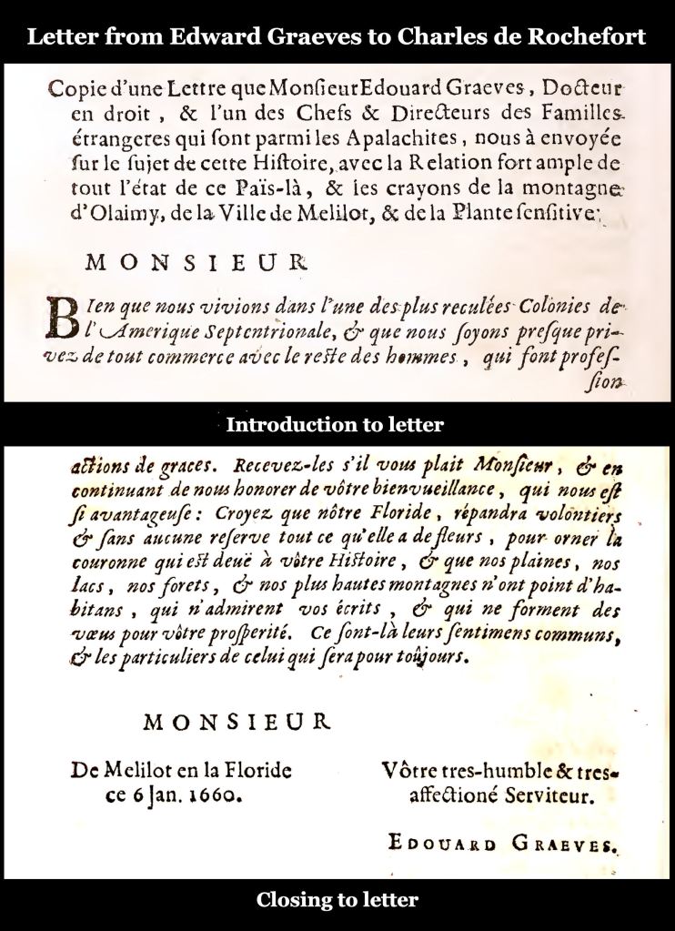We do know that Melilot was still thriving in 1660. Below are the beginning and the end of a long letter, written in French on January 6, 1660, by Edward Graeves to Charles de Rochefort. The letter included sketches for the correct appearance of the Appalachian Mountains, plus the architecture of the Apalache. Unfortunately, the sketches were never converted to engravings and published.